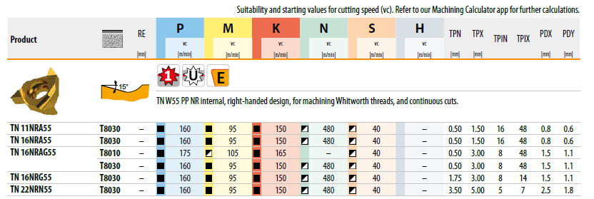 ΠΛΑΚΙΔΙΑ TOΡNOY ΣΠΕΙΡΩΜΑΤΟΣ ΑΡΝΗΤΙΚΑ ΜΕ ΤΡΥΠΑ ΤΥΠΟΥ TN ..NR55° ΓΕΝΙΚΗΣ ΧΡΗΣΗΣ ΜΕ ΓΩΝΙΑ ΚΛΙΣΗΣ ΚΟΠΗΣ 15° ΜΕΡΙΚΟΥ ΠΡΟΦΙΛ ΓΙΑ ΥΛΙΚΑ ΣΙΔΗΡΟΥΧΑ (P), ΑΝΟΞΕΙΔΩΤΑ (M), ΜΑΝΤΕΜΙ (K), ΜΗ ΣΙΔΗΡΟΥΧΑ (N) ΚΑΙ ΤΙΤΑΝΙΟ (S). ΓΙΑ ΕΣΩΤΕΡΙΚΗ ΤΟΡΝΕΥΣΗ, ΔΕΞΙΑ, ΓΙΑ ΔΗΜΙΟΥΡΓΙΑ WHITWORTH ΣΠΕΙΡΩΜΑΤΩΝ. ΓΙΑ ΣΥΝΕΧΟΜΕΝΗ ΚΟΠΗ. ΚΑΤΑΛΛΗΛΑ ΓΙΑ ΤΙΣ ΕΞΗΣ ΜΑΝΕΛΕΣ: TTIR & STIR. ΤΑ ΠΛΑΚΙΔΙΑ ΔΙΑΤΙΘΕΝΤΑΙ ΣΕ ΚΟΥΤΑΚΙ ΤΩΝ 5 ΤΕΜΑΧΙΩΝ.